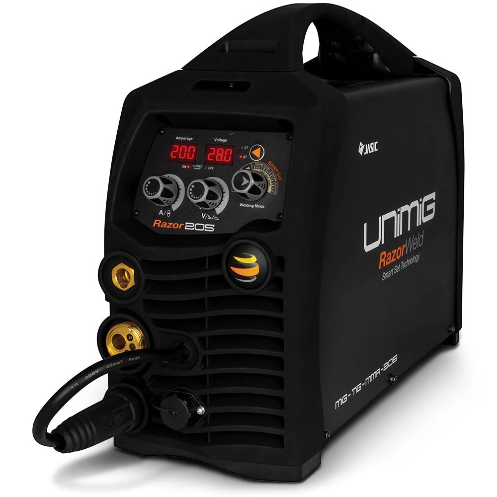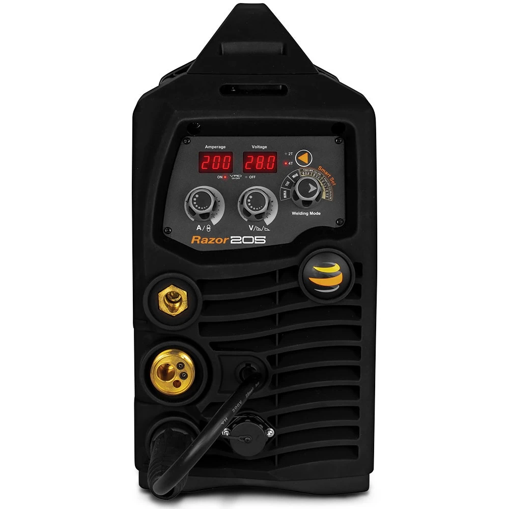 The RAZORâ„¢ 205 SMART SETâ„¢ is one of the easiest multi-process welders available, offering MIG, TIG and STICK welding functions. The SMART SETâ„¢ Synergic MIG technology takes the guesswork out of MIG welding, so you get more done in less time. With the inclusion of a Spool Gun connection and lightweight construction, the RAZORâ„¢ 205 SMART SETâ„¢ goes from worksite to workshop with ease.