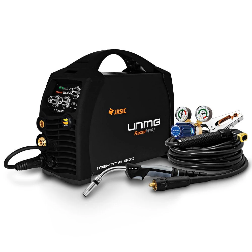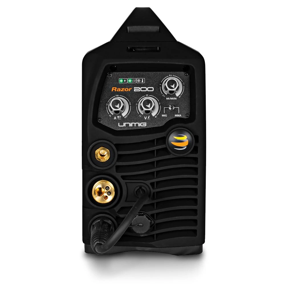 The RAZORâ„¢ 200 is the perfect MIG and STICK welder for the professional welder wanting a powerful machine with a portable body. Fitted with a 15 AMP plug, this machine is designed for the workshop and for site work. The Spool Gun connection gives you the added flexibility of using softer wires and smaller spools, giving you all the features you need in a lightweight machine.